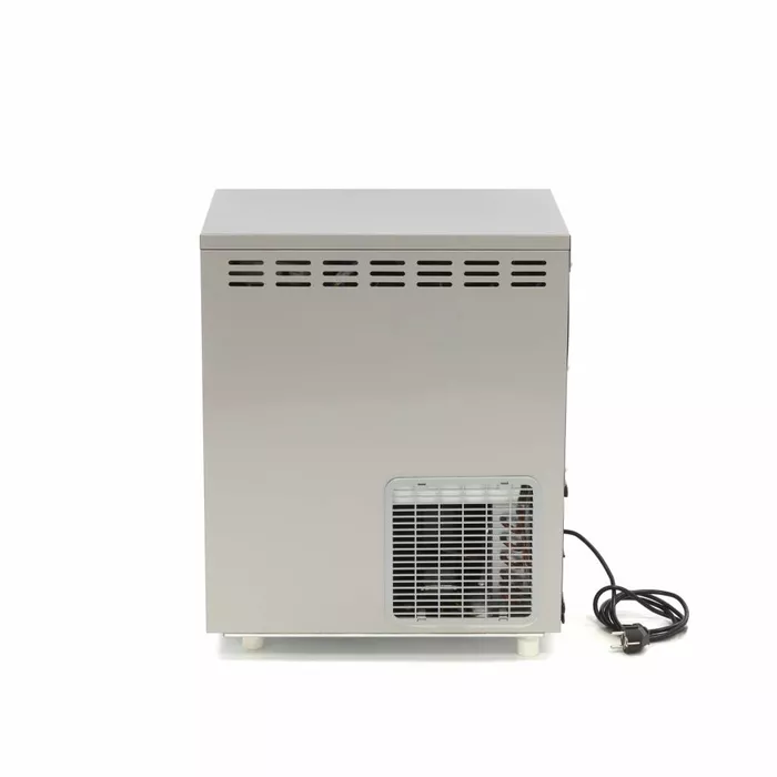 Model je idealna mašina za postavljanje ispod pulta, što znači da je možete postaviti direktno ispod pulta ili šanka. Na ovaj način, imate ledene pahulje pri ruci, spremne za odmahšnju. Ova mašina je hlađena zrakom sa stražnje strane, pa je najbolja za unutarnju upotrebu. Kako bi se spriječilo preopterećenje mašine za led, opremljena je zaštitom od preopterećenja. Također je moguće povezati mašinu za led s priključkom za pitku vodu pomoću priloženih crijeva. Automatsko snabdijevanje vodom osigurava da je mašina uvijek spremna za neprekidnu proizvodnju leda. Mašina za led nije opremljena pumpom za odvodnju. Crijevo za odvodnju treba biti spojeno niže od izlaza mašine. Zahvaljujući učinkovitom sistemu hlađenja, dobivate ledene pahulje visoke kvalitete. Korišteni rashladni medij je R290. Na upravljačkoj ploči nalazi se nekoliko svjetala upozorenja koja jasno pokazuju kada postoji kvar, kada je spremnik pun ili kada je razina vode preniska.