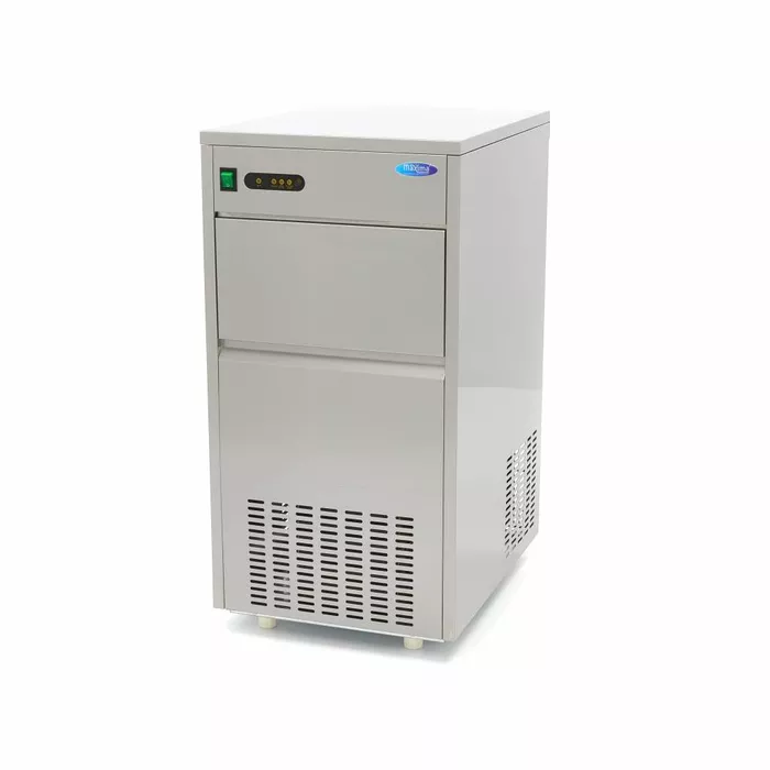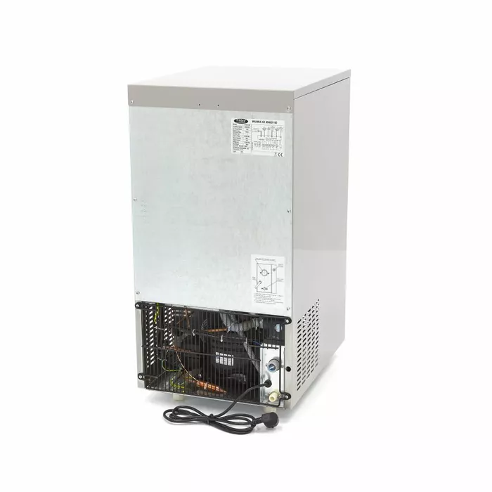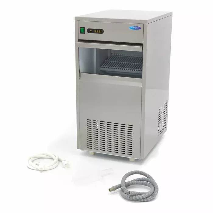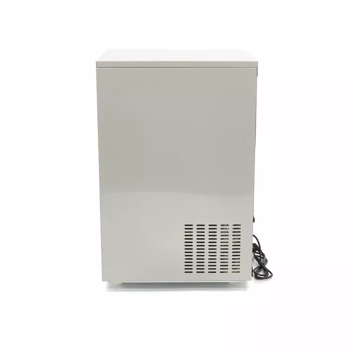Ovaj aparata za led je dobro izoliran i higijenski uređaj. Dizajniran je s naglaskom na jednostavnu upotrebu. Stražnji dio aparata je hlađen zrakom, što znači da je pogodan za upotrebu u prostorijama koje nisu previše tople. Također ćete dobiti praktičnu lopaticu za vađenje leda iz aparata na način koji je praktičan i higijenski. Osim toga, ovaj aparat za led ima zaštitu od preopterećenja kako biste mogli raditi sigurno i ne brinuti se o preopterećenju uređaja. Za zamrzavanje vode, uređaj je opremljen učinkovitim sustavom hlađenja, a koristi se rashladno sredstvo R290. Također dobivate opskrbne cijevi za povezivanje aparata za led s priključkom za pitku vodu. Nema potrebe ručno dodavati vodu. Aparat je potpuno automatski, pa ga možete ostaviti da radi sam. Aparat za led nije opremljen pumpom za odvodnju. Cijev odvoda trebala bi biti povezana niže od izlaza aparata. Na prednjoj strani aparata za led nalazi se korisnički prijateljska upravljačka ploča s upozoravajućim svjetlima. Ako dođe do kvara, ako je spremnik za skladištenje pun ili ako je razina vode preniska, indikatorska svjetla će vas obavijestiti.