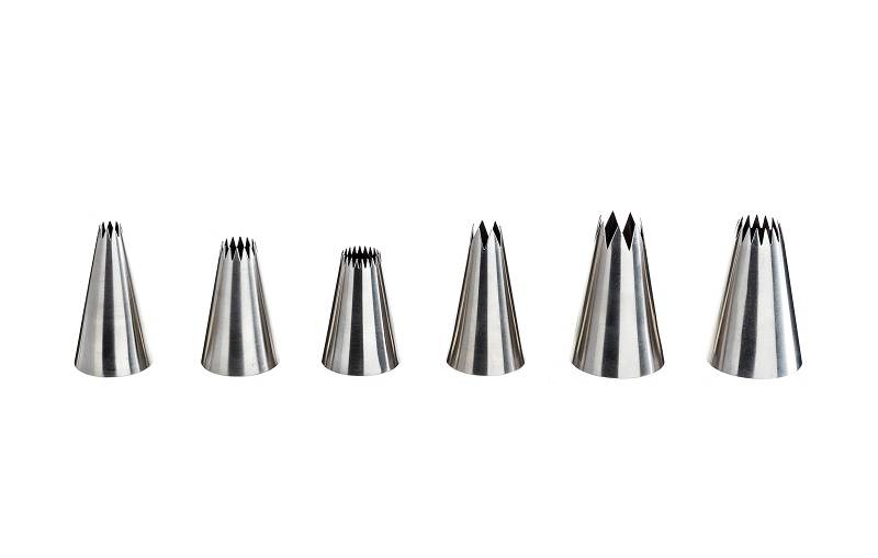 Set od 6 rebrastih nastavaka za dresir vreće. Materijal: inox 18/10 Perivo u mašini za suđe.