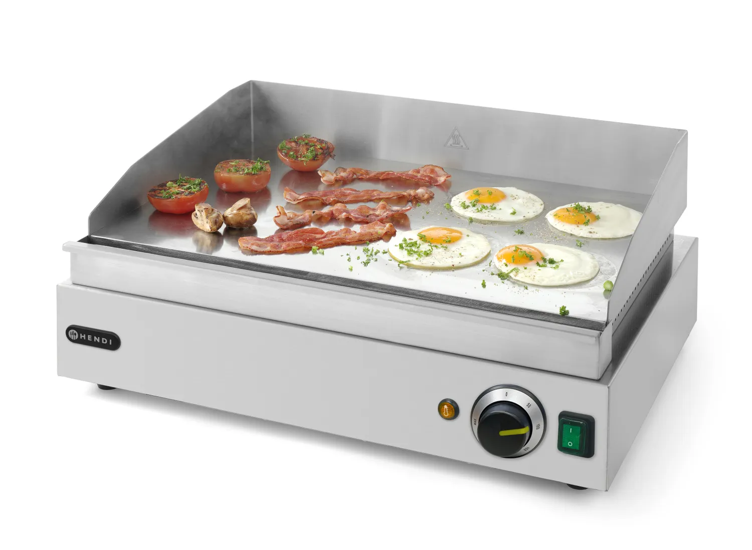 Ploča za pečenje dimenzija 518×330 mm, u potpunosti glatka. Kućište od nehrđajućeg čelika. Površina od tvrdog hroma (ploča debljine 9 mm) omogućava lako čišćenje. Opremljena je uklonjivom posudom za skupljanje masnoće i visokim zaštitnim ivicama. Besprijekorno podesiv termostat do 300°C. Zaštita od pregrijavanja. Pogodna za neprekidnu upotrebu. Prekidač za uključivanje sa ugrađenom signalnom lampicom. Protuklizne nožice.