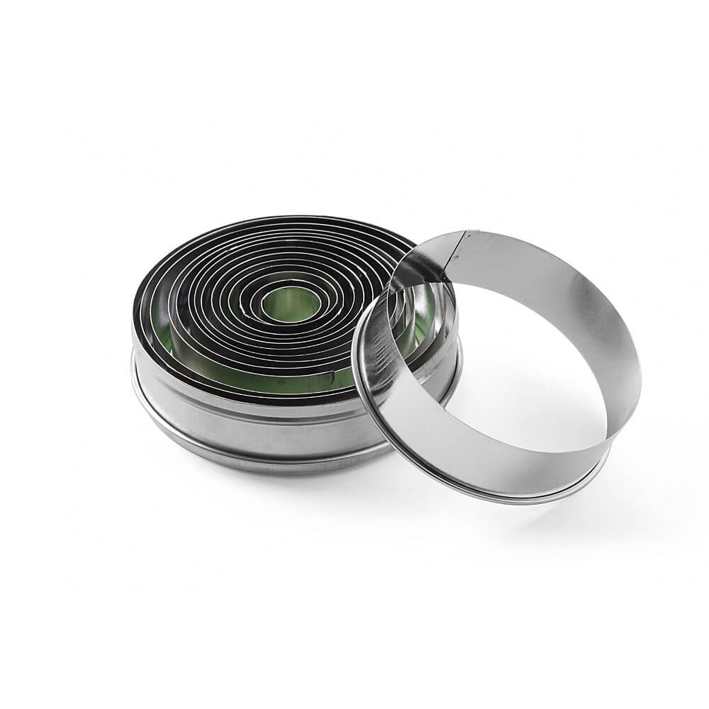 Set 14 inox kalupa sa zaobljenim rubom za izrazivanje tijesta u krugove. U setu se nalaze kalupi različitih promjera od 18 do 108 mm. Može se prati u mašini za suđe.