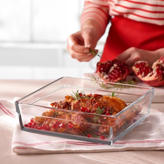 Vatrostalna staklena posuda - idealna i za pečenje i serviranje hrane za Vaše goste! Dimenzije: 22.7x22.7cm Pakovanje: 1/1.