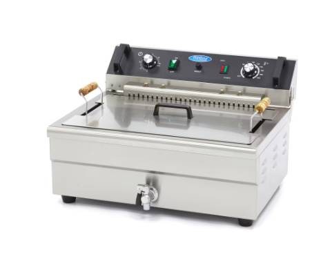 Pripremate li velike količine hrane u svojoj profesionalnoj kuhinji? Ova iznimno velika duboka friteza kapaciteta 20 litara dobrodošao je dodatak svakoj pekari, ribarnici, pržionici krumpirića ili drugim ugostiteljskim objektima. Kupci više ne moraju čekati dok vi stručno pržite velike porcije ribe, pomfrita i drugih prženih grickalica. Ova profesionalna duboka friteza ima dva grijaća elementa koja se mogu postaviti pomoću preciznog termostata. Možete odabrati željenu temperaturu između 50°C i 200°C. Ova duboka friteza također ima koristan indikatorski svjetlosni signal koji pokazuje kada je ulje spremno. Radi na 400V napajanja.