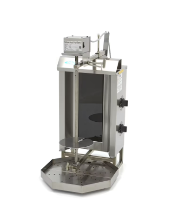 Pouzdani motor smješten je na vrhu roštilja. Na taj način, ne morate postaviti roštilj na niski stol, već ga možete staviti na bilo koji pult dok i dalje možete rezati meso duž cijele duljine ražnja. Ovaj roštilj isporučuje se bez reflektirajućih ekrana od nehrđajućeg čelika sa strane. Mast koja dolazi s mesa skuplja se u odvojenoj posudi za kapljanje od nehrđajućeg čelika koja dolazi s filtrom. Da biste bili potpuno spremni i poslužili ukusna grilana jela u svom ugostiteljskom objektu, naručite poseban električni nož za kebab koji vam pomaže da lakše narezujete meso s ražnja.