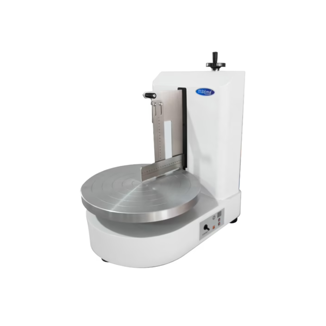 Kolač se ravnomjerno rotira na platformi, dok vertikalni i horizontalni noževi osiguravaju da se sav višak glazure/glazura ukloni, stvarajući urednu stranu i vrh.
