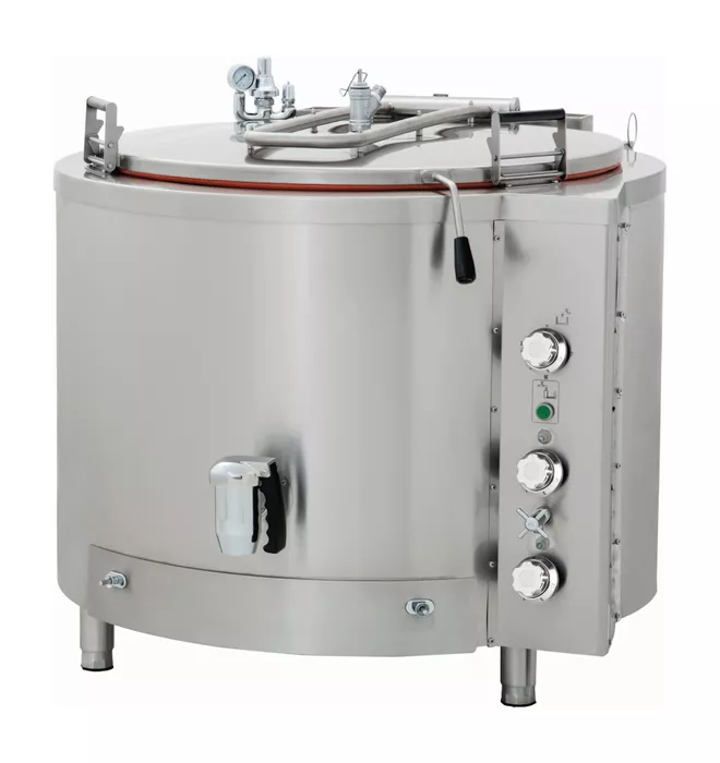 Ovaj kazan za kuhanje ima dvostruki zid gdje je unutrašnjost ispunjena vodom. Kao rezultat toga, ne zagrijava se izravno s dna kazana, već ravnomjerno duž cijelog zida. Ovaj sustav neizravnog grijanja smanjuje rizik od sagorijevanja hrane, čineći ga idealnim za pripremu tekuće hrane poput juha, umaka, juha i krema. Izolacijski materijal od kojeg je izrađen kazan također smanjuje gubitak topline, pa je potrošnja energije svedena na minimum. Osim toga, sigurnosni termostat štiti od niske razine vode kako bi se spriječilo brzo kuhanje jela. Praktični manometar smješten je na vrhu kazana kako bi se mogao očitati tlak.